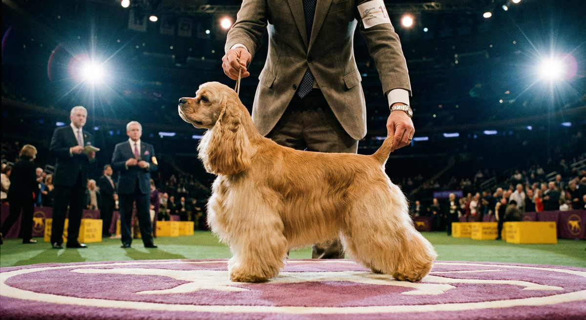 Собаки заходят в ринг полукругом, ведущий по микрофону называет породу и кличку. Когда объявляют «American Cocker Spaniel, Golden Glory», заводчик чувствует, как собака слегка напрягает корпус — он тоже слышит имя.