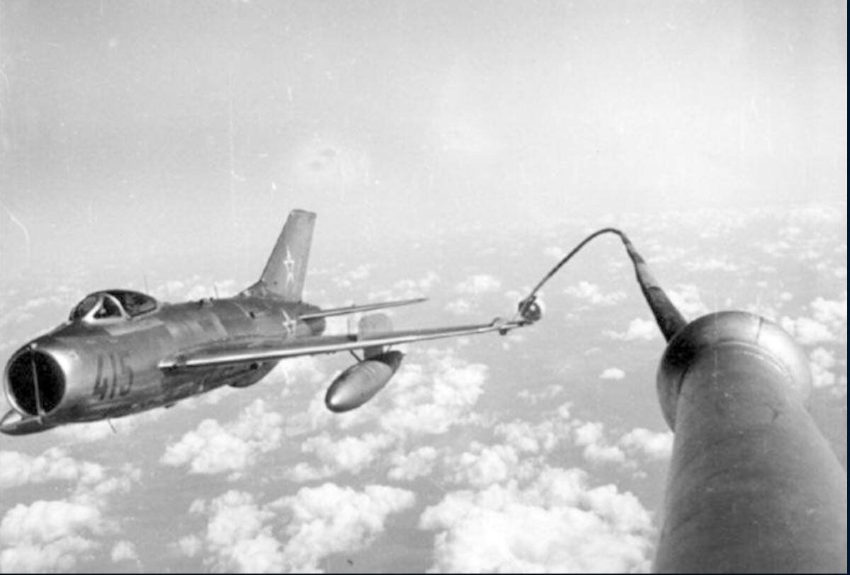 Отработка дозаправки в воздухе истребителя МиГ-19 от бомбардировщика Ту-16