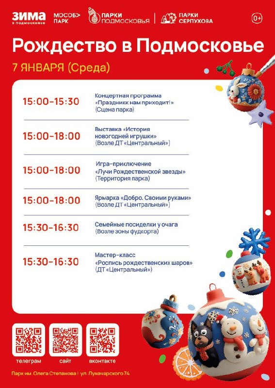 ✨ Приглашаем в парк 7 января на Рождество 🕒15:00-18:00 Вас ожидает: 🔹Выставка «История новогодней игрушки» 🔹Игра – приключение «Лучи Рождественской звезды» 🔹Концертная программа «Праздник к нам приходит!» 🔹Семейные посиделки у очага 🔹Мастер – класс «Роспись рождественских шаров» 🔹Ярмарка "Добро. Своими руками" 🚫 Возраст: 0+ 📆 07.01.2026 🏢 Парк им.Олега Степанова 📍 г. Серпухов, ул. Луначарского, д.74 💰 Вход свободный❗️ ⭐Поддержать канал голосом 💰 Канал Вакансии Серпухова ✅ Мероприятия Серпухов https://dzen.ru/id/66f01c6eb4c6fe60c9ca1608 http://vk.com/serpukhov_events http://dzen.ru/serpukhov_events
