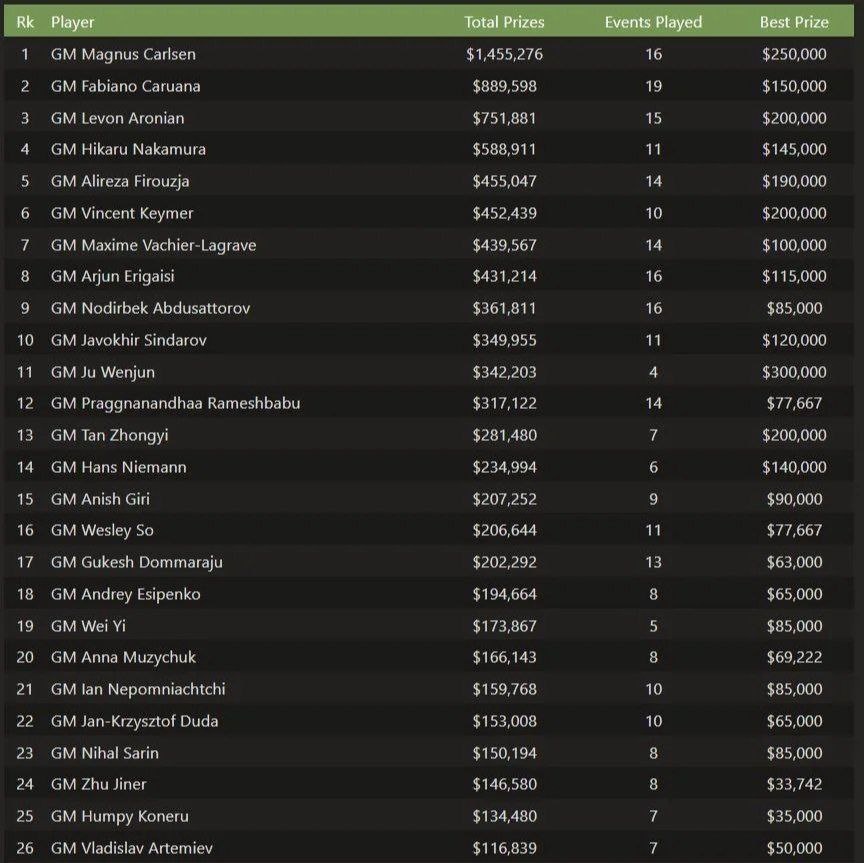 Вот ТОП-3 по сумме призовых 💰👇 🥇 Магнус Карлсен — $1 455 276 Абсолютный лидер. Огромный отрыв от всех остальных. 🥈 Фабиано Каруана — $889 598 Стабильность + постоянное участие в топ-турнирах. 🥉 Левон Аронян — $751 881 Опыт, класс и умение «выстреливать» в нужный момент. 🔥 В топ-10: — Накамура — Фируджа — Кеймер — Вашье-Лаграв — Эригайси — Абдусатторов — Синдаров ❓Как думаешь: 🔥 — заслуженно 👍 — шахматы недооценены финансово Подписывайся на Телеграмм: https://t.me/Reshetnikovchess