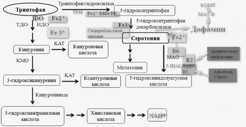 Мы рассматриваем обмен белка триптофана как основного источника нашей энергии и сырья для производства нейромедиаторов: серотонина, дофамина, тирозина, норадреналина и адреналина.