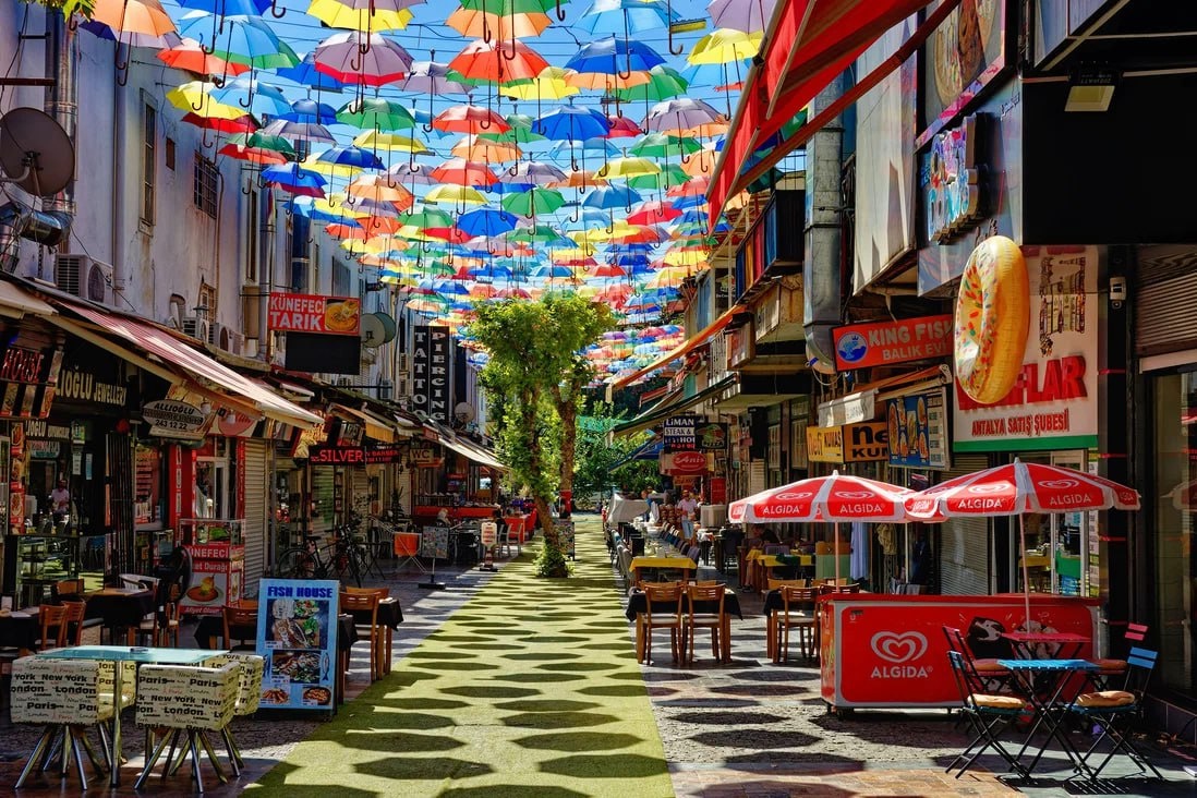 Пешеходные улочки, украшенные парящими в воздухе многоцветными зонтами, появились в городах по всему миру. Анталья — один из них. Такая инсталляция привлекает туристов с 2013 года.