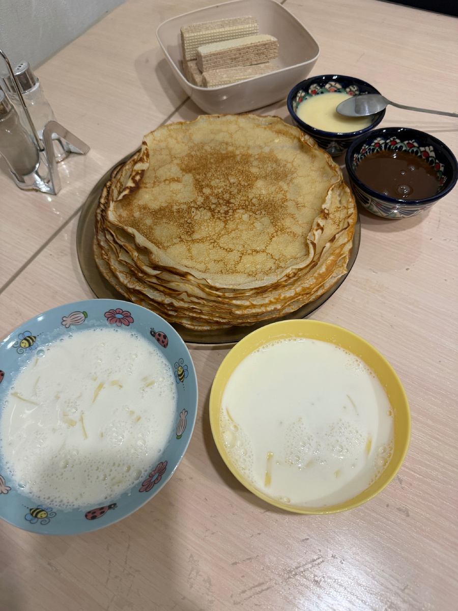 Вчера нажарила блинов, сегодня с утра подала всем их на завтрак. У детей ещё молочная лапша.