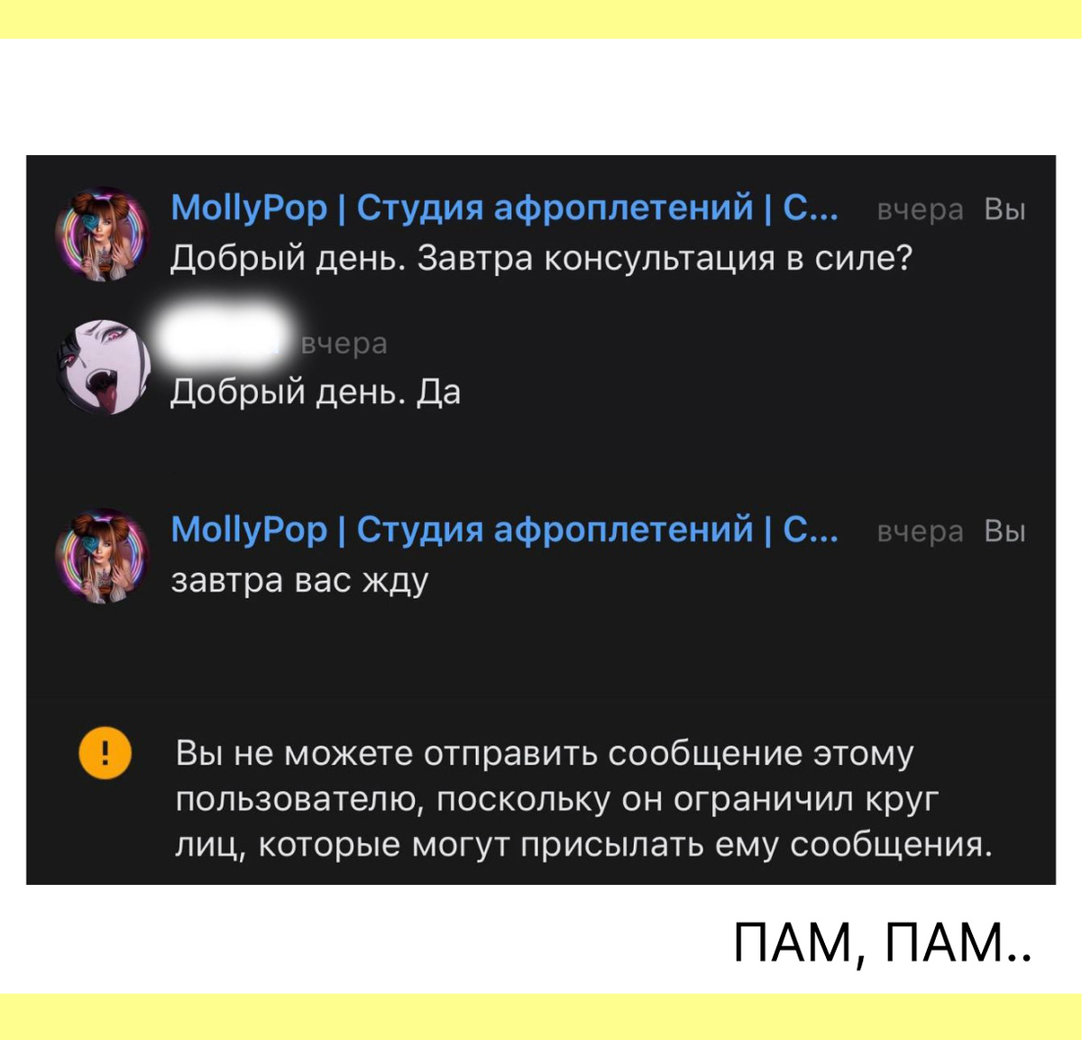 Я человек очень лояльный к придури людей. Да и 14 лет работы с людьми дают тебе терпение буддийских монахов. Но одного я не пойму никогда. Ты записываешься на консультацию. Да, она бесплатная, да никто никому ничего не должен, и ценности в этом нет. Ты подтверждаешь запись. Потом, допустим, тебя резко украли цыгане и вернули обратно из-за твоего паршивого характера, и теперь ты не успеваешь на консультацию. И вместо того, чтобы просто написать "извините, у меня поменялись планы". Можно без "извините", потому что культура таким людям не присуща. Вам приходит абсолютно идиотская идея кинуть рабочую страницу мастера в бан. Потому что намного круче поставить перед фактом, чем предупредить. Хотя мастер, находясь в неведении, уже приехал в студию и потратил своё личное время. Сегодня за день у меня было 2 таких мадамы! Причем одна из них уже не считала нужным ответить на подтверждение записи. А потом, спустя несколько месяцев, написала: "Извините, что тогда не ответила, можно перезаписаться