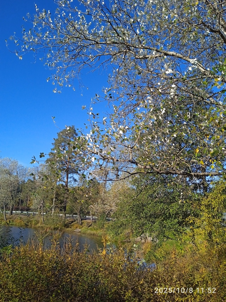 Кленовая аллея на Красном пруду в Ораниенбауме на тонкой прибрежной полосе вдоль дороги. Эта граница парка. За парковой оградой на высоком холме – красавец клён. Видимо, на аллее его детки.