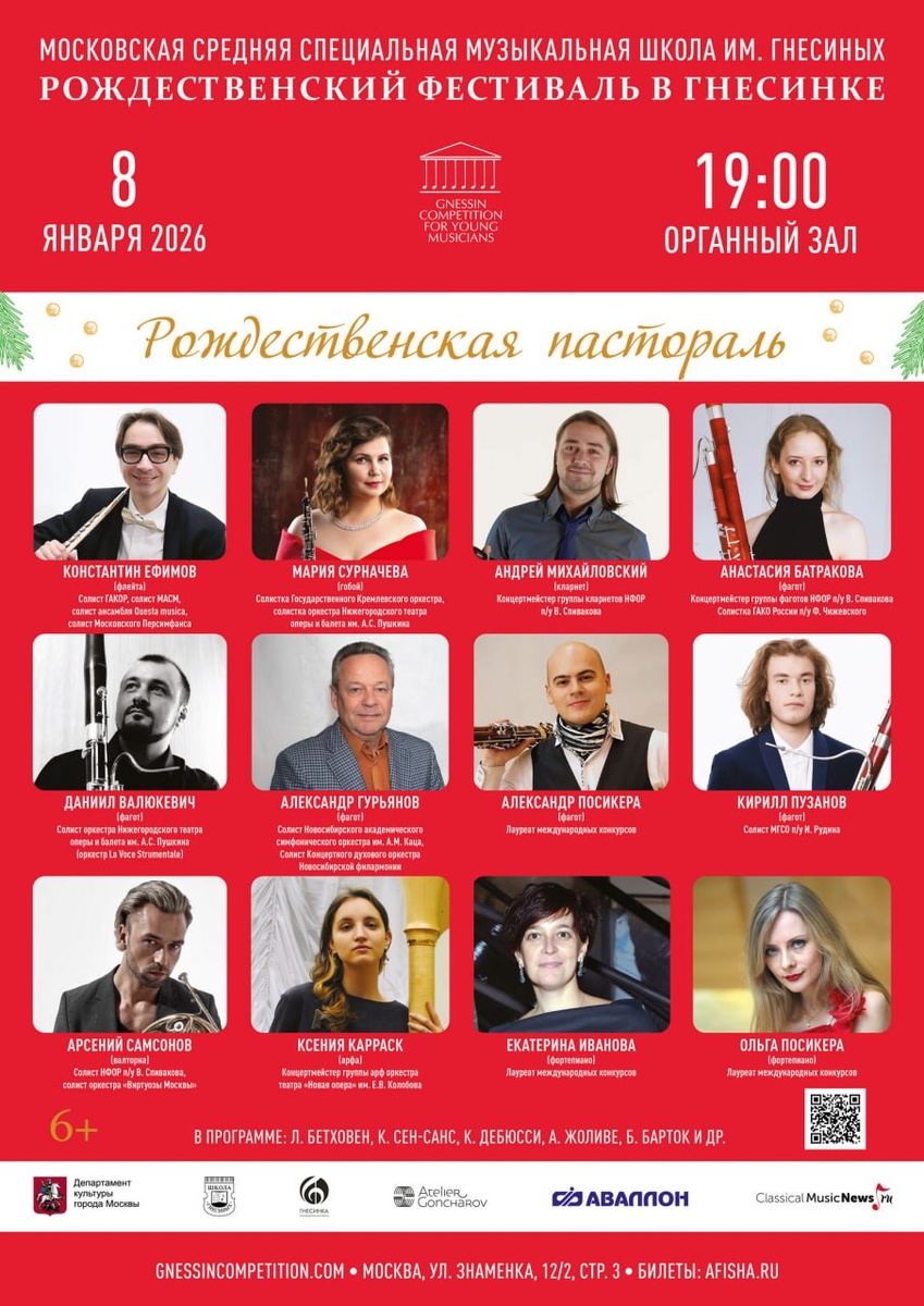 » 8 января 2026 в 19.00 приглашаем вас в атмосферу зимнего чуда — на концерт, в центре которого прозвучит «Рождественская пастораль» Андре Жоливе — одно из самых поэтичных программных произведений XX века, посвящённых теме Рождества. В этой музыке оживает рождественская ночь: тихие звоны, шелестящие трели, нежные хоральные интонации и пасторальные мотивы передают трепет ожидания и свет, пробивающийся сквозь сумрак. Главный проводник в волшебный мир концерта — фагот. Именно он поведёт слушателя от созерцательных, наполненных тишиной образов Девы Марии, природы и поэзии Поля Бурже — к виртуозным вариациям на тему любви и народных праздничных танцев. В этот вечер фагот станет вашим личным, самым чутким и вдохновляющим танцевальным партнёром, закружив в ритмах румынского и венгерского фольклора. Уникальность программы — в диалоге эпох и стилей: моцартовская грация (преломлённая через призму Бетховена), импрессионистская утончённость Дебюсси, модернистская поэзия Жоливе, народные мотив