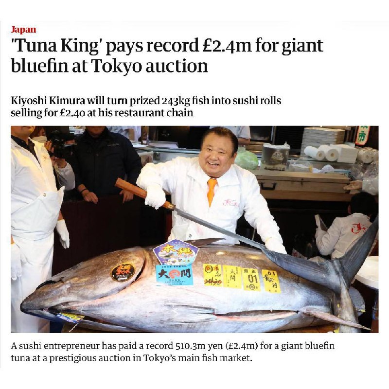 Покупателем рыбы весом в 243 кг стал Кийоши Кимура, президент сети суши-ресторанов Sushi Zanmai, что известен своей любовью к рыбным аукционам. Из одной такой рыбины получилось бы 6 500 порций суши или 10 400 роллов. ⏩ P.S. Оставайтесь с нами и будьте в курсе всего самого интересного! 🔷Подпишись на канал https://dzen.ru/id/63d7a34be120020aa9307269 #новости #мир #общество