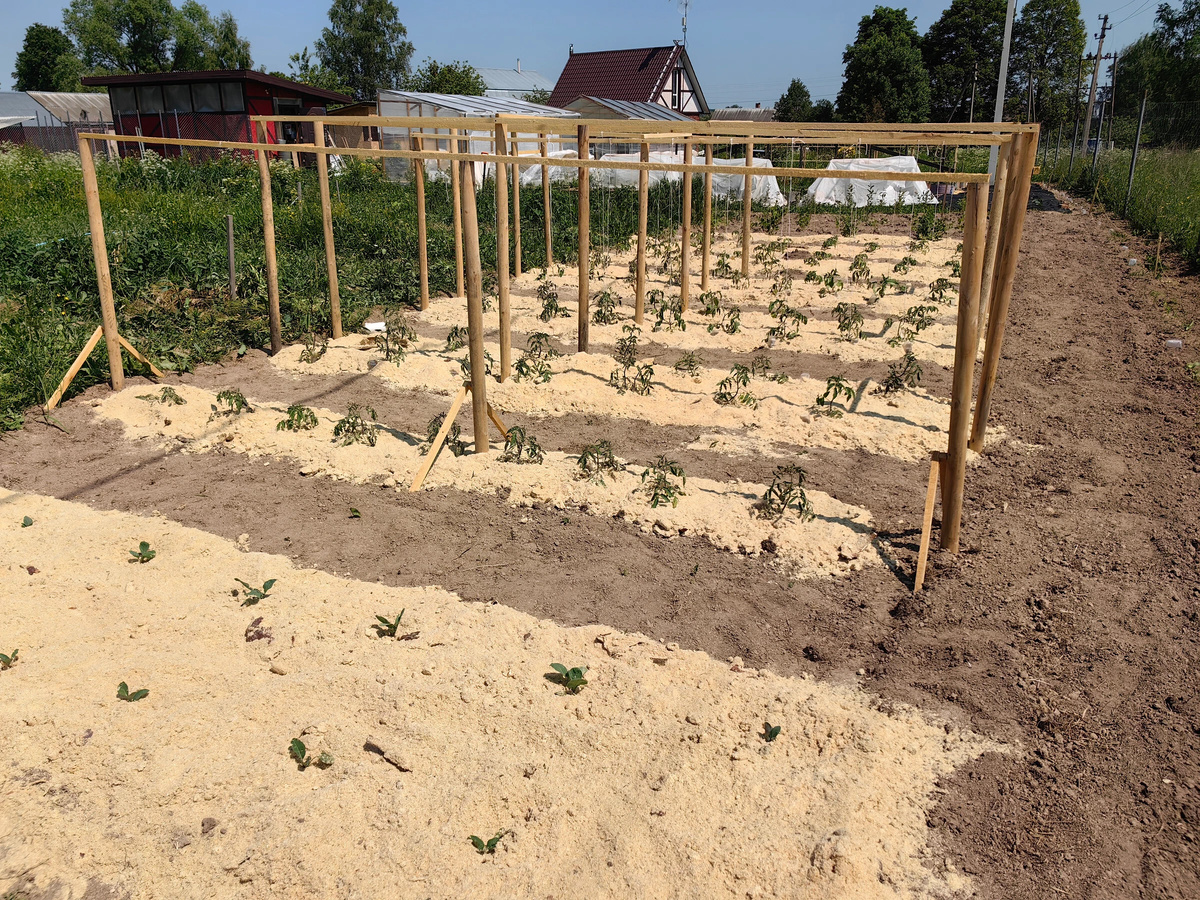 У меня три стойки парные под двурядную посадку и одна одинарная. Она как раз на переднем плане на фото выше. Вот если все затягивать крышей и делать пару стенок, то два крайних ряда мне придется не засаживать совсем. Возможно на одинарный ряд я посажу перцы или баклажаны, посмотрим. Но томатов там точно не будет. И раз так, то у меня остается пять рядов примерно по восемь кустов в каждом. Иногда я и по девять сажаю, но расчетных у меня все же восемь лунок. Тогда получается, что у меня может добавиться еще 40 посадочных мест. Земля там уже второй год закрыта была черной нетканкой, она пашется, но сорняки прут только в путь. Так что на время посадок томатов я опять все закрою от сорняков. Надо минимизировать затраты труда.