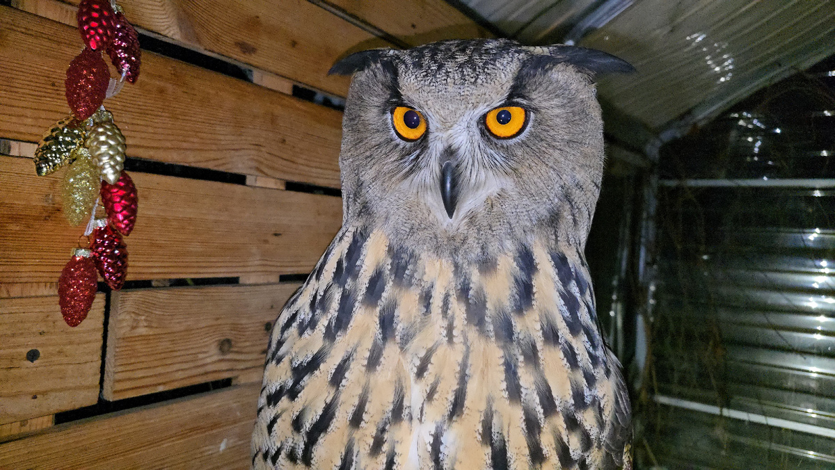 Я отнесла сову филина Ёлку в дом на то время, пока мы стряхиваем снег с её вольера.
