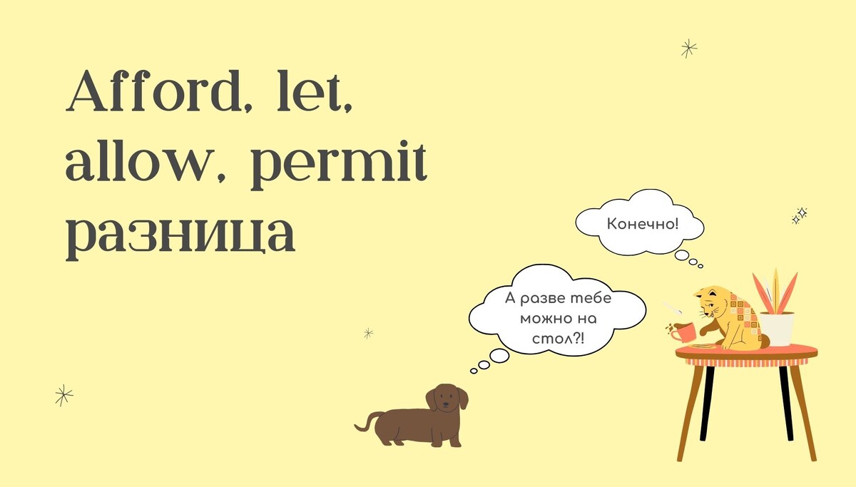 Уверены, что не путаете afford, let, allow, permit? Да, они переводятся одинаково, и внешне, может, похожи, но они не взаимозаменяемы. Afford - позволить себе (финансово, по времени, эмоционально) ❇️ слово “себе” не переводим, оно уже включено в afford Используем, когда речь идёт о материальной или нематериальной возможности сделать что-то. Raisa can’t afford to buy a car right now. - Раиса не может себе позволить купить машину сейчас. Boris can’t afford to waste time. - Борис не может себе позволить тратить время. We can’t afford to make mistakes. - Мы не можем себе позволить делать ошибки. ❇️ После afford (если мы дальше говорим о действии, которое будем себе позволять) всегда используется to + глагол (afford to do something). Let - позволять, разрешать (разговорный стиль) Используем, когда кто-то разрешает другому человеку что-то сделать. Veniamin’s mom didn’t let him _go to that party. - Мама Вениамина не разрешила ему пойти на вечеринку. Let me _help you. - Позволь мне помочь те