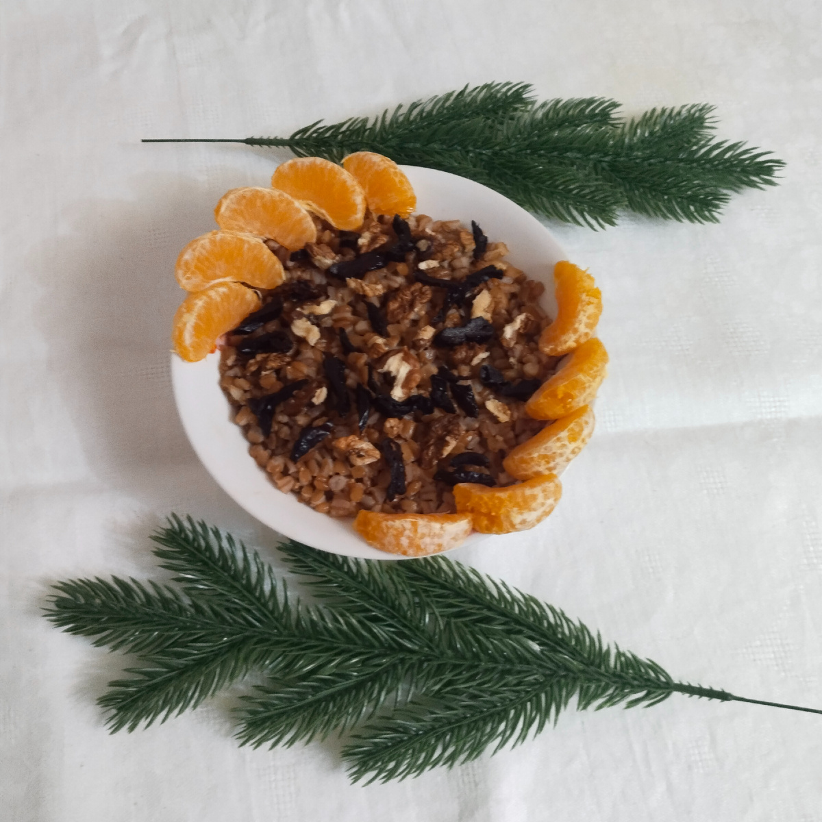 Готовила сегодня Рождественское блюдо , чтобы разговеться. Пшеницей не запаслась. Но специально на днях купила крупу, которая называется куркут. Ее и сварила. Меда добавила, как остыла, орехов грецких. Изюм, что у меня был, я забраковала. Жаль , что раньше его не попробовала. Размочила чернослив и нарезала тонкими полосочками. А сверху все украсила дольками мандариновыми. Вроде неплохо