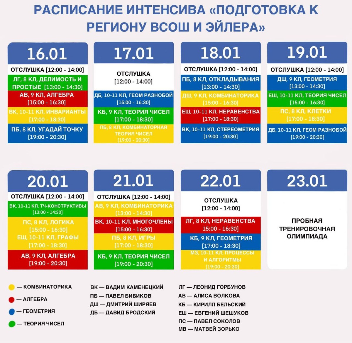 Мы уже говорили, что с 16 по 23 января пройдет самый масштабный интенсив к региону ВсОШ и Олимпиаде Эйлера от онлайн-школы «Дабромат» для учеников 8-11 классов. Пришло время поделиться расписанием! Каждый день проходит 3-4 занятия на разные темы разного уровня сложности. Можно ходить хоть на все, но лучше каждый день выбирать 1-2 наиболее подходящих вам по уровню сложности и теме занятий. Программа интенсива создается авторами задач ВсОШ и Эйлера и тренерами сборных Москвы, Санкт-Петербурга и других городов, которые точно знают все нюансы региона. — 8 дней плотной работы, 56 часов занятий — 3–4 пары в день разного уровня сложности в прямом эфире — 7 устных отслушек — Пробная олимпиада с проверкой по реальным критериям — 10+ преподавателей тренеров сборных на ВсОШ Москвы, Санкт-Петербурга и др — Разбор не только решений, но и оформления При хорошем результате на олимпиаде интенсив «Дабромата» по сути выходит бесплатным — призёрам региона возвращают половину стоимости, а победителям