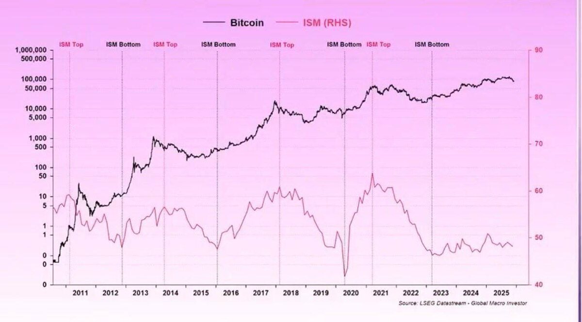 ISM вышел 47.9. Ниже 50. Сжатие. Контракция. И каждый раз, когда вижу такие значения, ловлю себя на одной и той же мысли: биткоин почти никогда не начинается на эйфории. Он начинается на усталости. ISM — это не «индикатор для трейдинга». Это про дыхание экономики. Про то, когда бизнес замирает, а потом — медленно, нехотя — снова начинает шевелиться. Если посмотреть честно, без подгонки под любимую теорию, все большие бычьи рынки по BTC начинались не по календарю и не по халвингу. Они начинались тогда, когда ISM разворачивался вверх из зоны боли. 2012. 2013. 2014. Не «четырёхлетний цикл». А бизнес-цикл. И вот сейчас картинка странно знакомая. ISM ниже 50. Рынок сомневается. Экономика остывает. А дальше в сценарии — вещи, которые никто не любит обсуждать заранее: смягчение. ставки. ликвидность. политика. QE никогда не запускают, когда «всё хорошо». Его запускают, когда уже неприятно. 2026 в этом смысле выглядит не как обещание, а как логичное продолжение процесса. Мне здесь важн