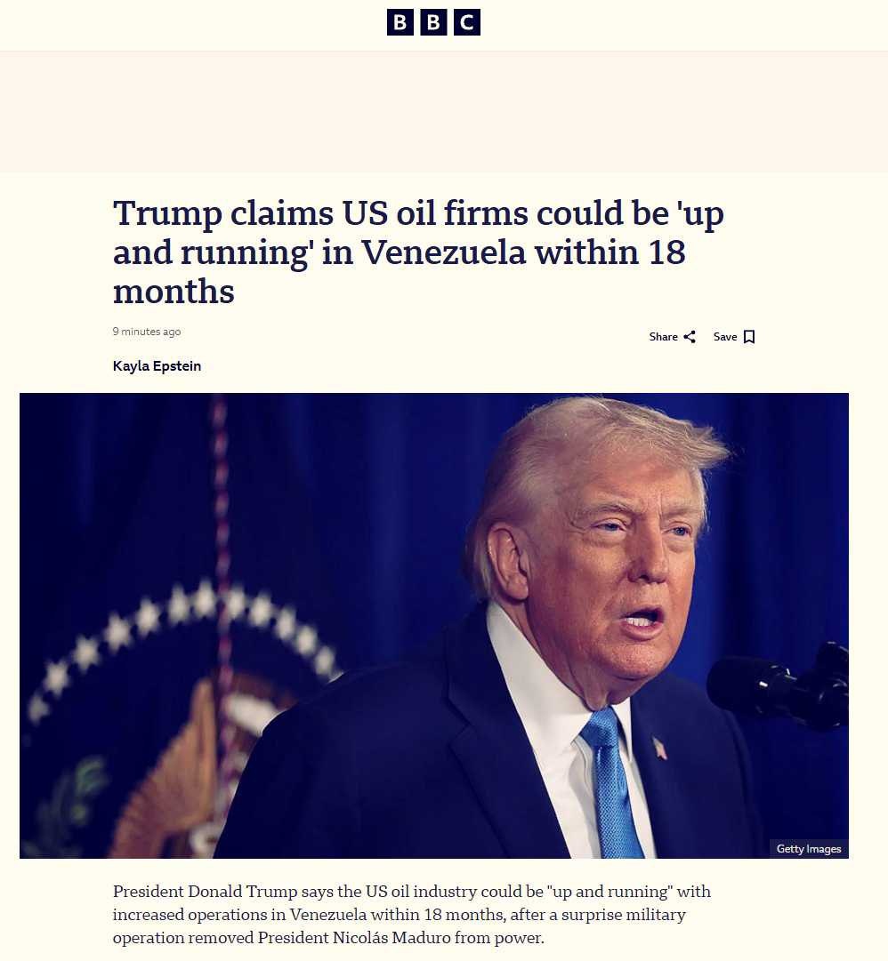 😂 Трамп утверждает, что американские нефтяные компании могут «начать работать» в Венесуэле в течение 18 месяцев — сообщает BBC