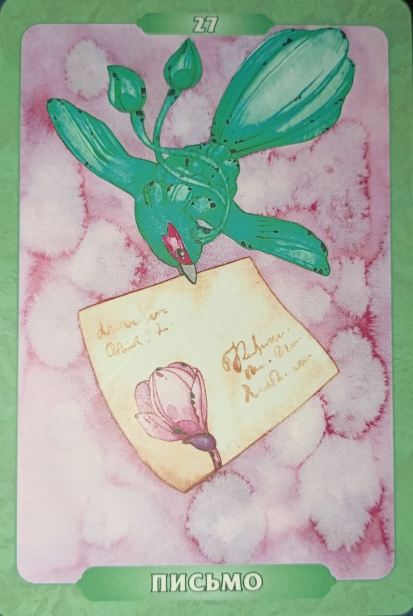 Карта ярко демонстрирует письмо в котором отчётливо видна адресат. Сама птичка его доставляет, а это значит срочность в нём есть. Её цепкость клювом горит о важности того, что в письме находится. Так как птичка маневрирует.... тем самым говорит о беспрепятственной доставке по назначению.