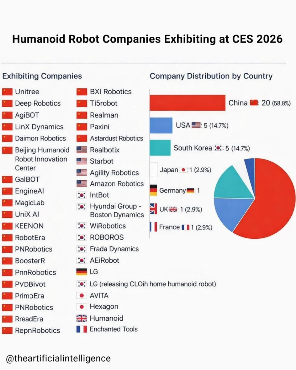 На выставке CES 2026 почти 60% всех компаний, представивших гуманоидных роботов, оказались китайскими — это больше, чем у всех остальных стран вместе взятых. Из 34 участников сегмента 20 представляют Китай, тогда как США и Южная Корея — по пять компаний каждая. Япония, Германия, Великобритания и Франция присутствуют скорее символически. Это наглядно показывает, что центр тяжести в разработке человекоподобных роботов сместился в Азию, где сочетаются масштабное производство, государственная поддержка и быстрый цикл внедрения технологий.