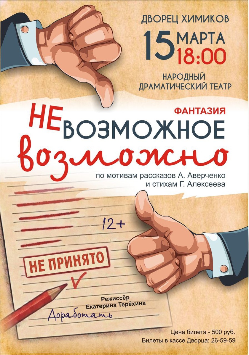 ! Спектакль «Невозможное возможно» Народного Драматического Театра 🗓️15 марта 🕕18.00 🎟️Билеты в кассе и на сайте Дворца химиков https://quicktickets.ru/dvorez-himikov/s1637 Спектакль поставлен по мотивам рассказов Аркадия Аверченко и стихов Геннадия Алексеева. Продолжительность 1 час 20 минут 📝Человеческая жизнь удивительно многогранна, но она может стать гораздо ярче и интереснее, если люди снимут маску чопорности, надменности и излишней серьезности. Мы часто забываем простую истину – относитесь ко всему философски спокойно, с юмором, самоиронией. Ситуации, в которые мы попадаем, бывают часто похожи на анекдот, только сознаем мы это после того, как «выпустили пар», потратили кучу нервов и здоровья. Главное, вовремя остановиться, суметь посмеяться над самим собой и над произошедшим, над всеми героями действа, так, как это делают наши актеры. Принять, понять, найти новое решение и жить дальше в гармонии со всем миром.