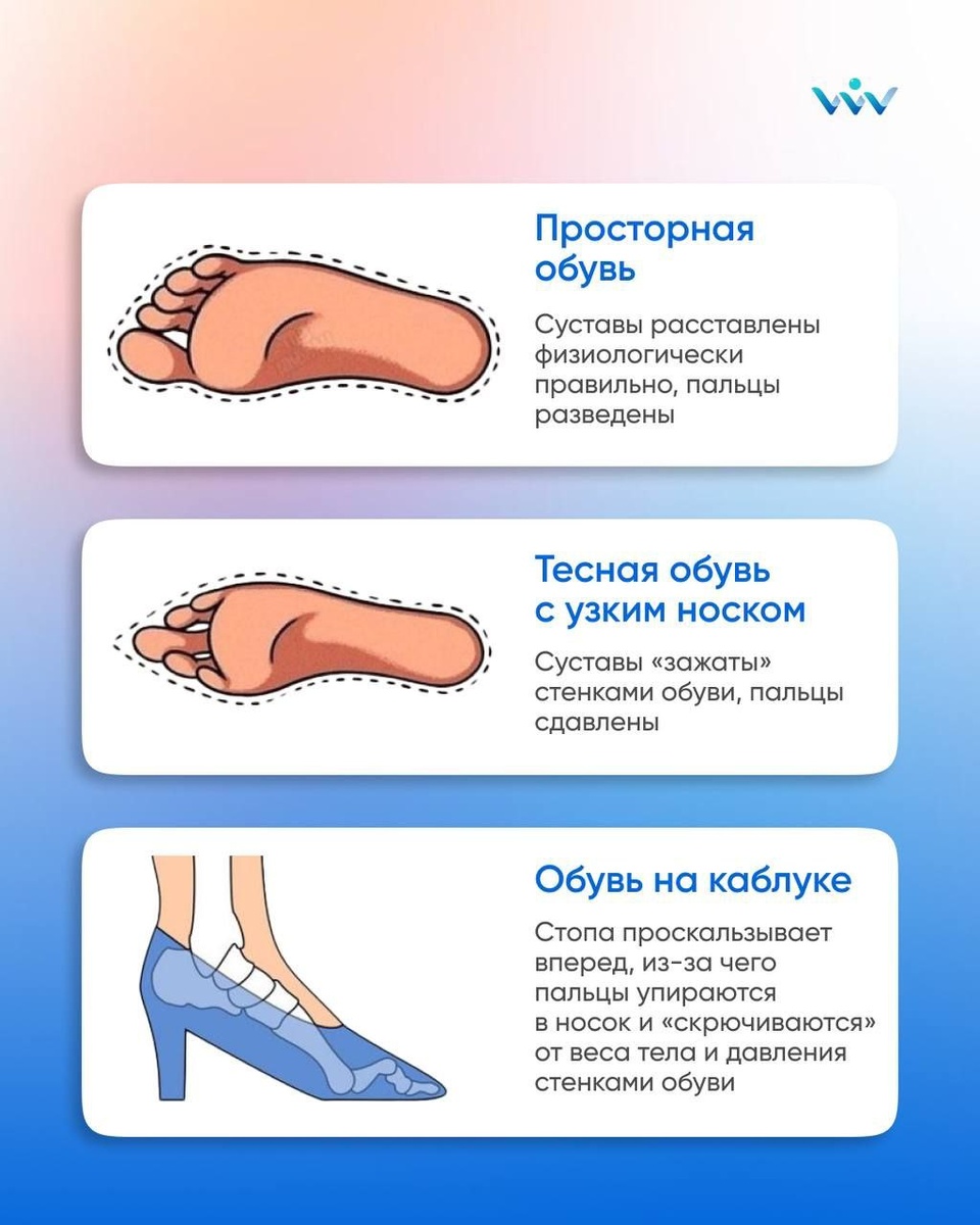 ! На картинке — три сценария развития событий для стопы: 1. Просторная обувь: Идеал, к которому призываем клиентов. Пальцы лежат свободно, кровообращение в норме, риск вросших ногтей и мозолей сведен к минимуму. 2. Тесная обувь с узким носом: Главный виновник онихолизиса, онихокриптоза (врастания) и деформации пальцев. Постоянное сдавление — это гарантированный путь в кабинет подолога. 3. Обувь на каблуке: Здесь вся нагрузка смещается на передний отдел стопы. Результат — натоптыши, деформация суставов и «удары» по ногтевой пластине при каждом шаге.