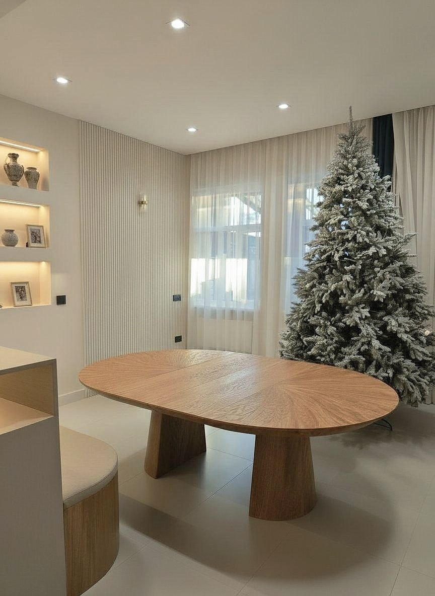 --- 🍄🟫 Стол с именем model030 вы хорошо знаете. Ваш любимый "грибочек" ✨ Приставка update означает, что стол обновлён. Теперь столешница имеет большую визуальную толщину и гармоничный угол нижнего скоса, а также веерную раскладку шпона на поверхности. 3️⃣ trio означает, что это раздвижной стол, который можно использовать в трёх размерах. --- 👌 Познакомил я вас с ним подробно, теперь можно добавлять в каталог на сайт. 📷 На фотографии стол диаметром 1500 мм с двумя вставками по 400 мм. Это значит, что раздвижение с одной вставкой даст размер 1900x1500 мм, а раздвинув на две вставки, стол будет иметь размеры 2300x1500 мм (именно этот размер сейчас на фотографии).