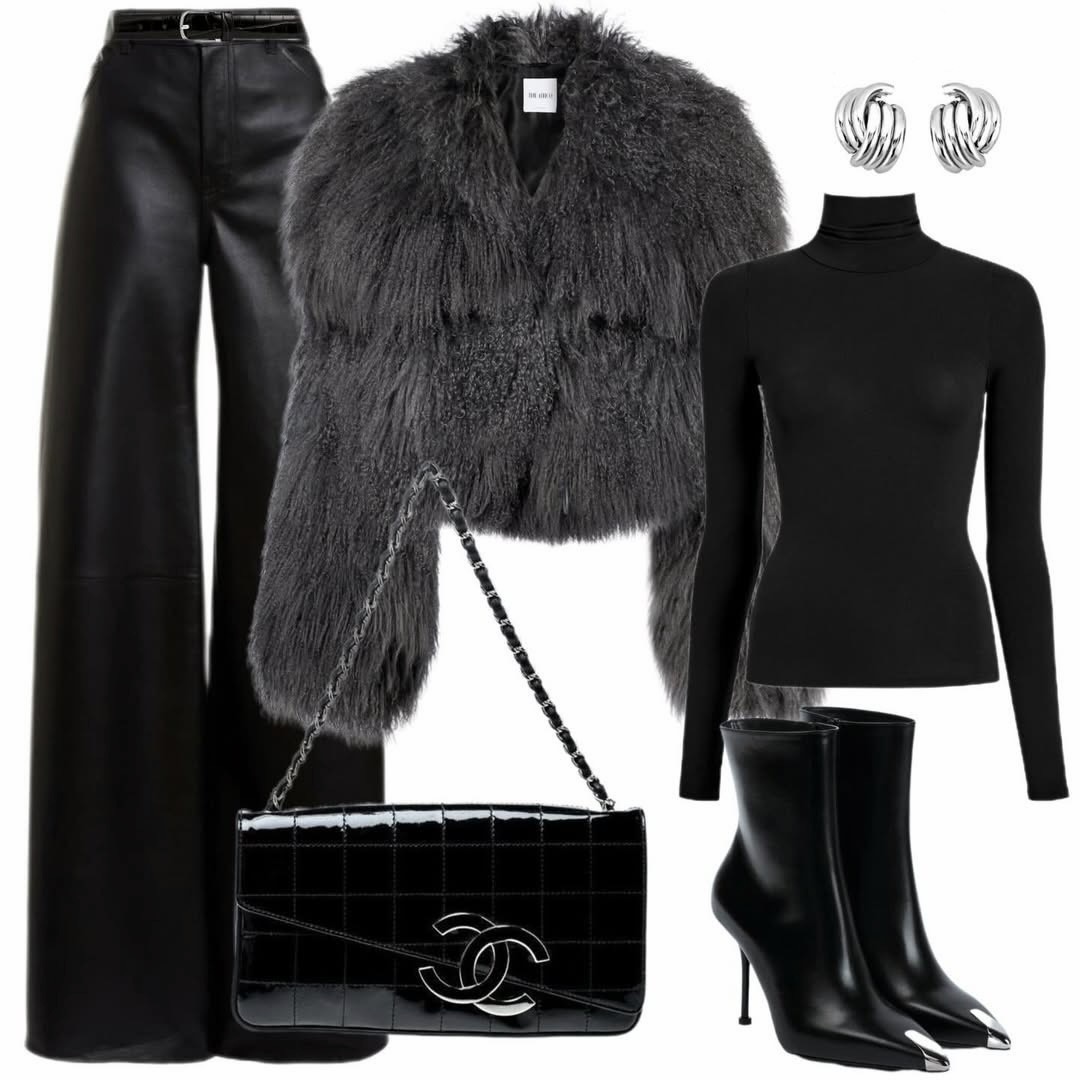 Этот образ построен на зрелой логике стиля: минимум цветов, максимум фактур, точные пропорции и металлические акценты там, где нужно поставить точку. Кожа даёт силу и характер, мех — роскошь и мягкость, лак — драму, а тонкий каблук завершает историю красивой линией.