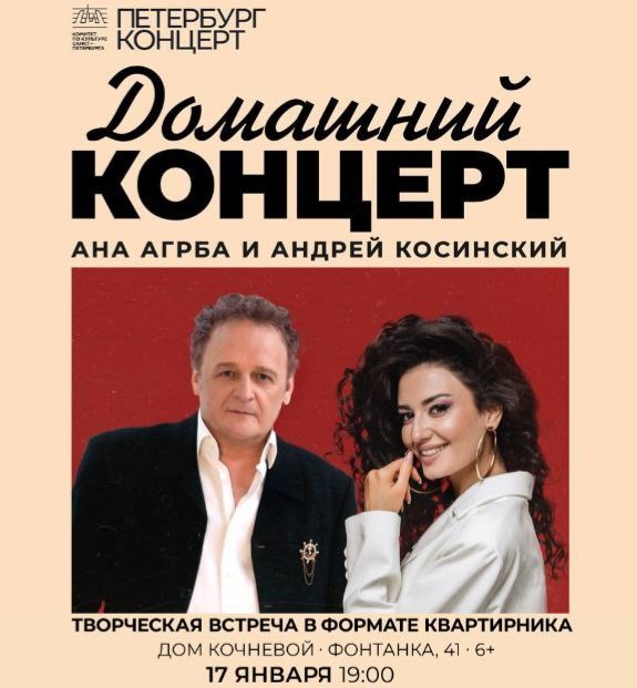 ! В новом году «Петербург-концерт» продолжает цикл мероприятий для всех ценителей музыки — домашние концерты в старинном особняке, расположенном в самом центре города. Герои нового «Домашнего концерта» — талантливые музыканты Ана Агрба и Андрей Косинский. Ана — молодая, обворожительная и харизматичная солистка, обладательница уникального природного тембра голоса. Андрей — настоящий петербургский денди, певец и композитор, который знает всё о написании стопроцентного хита. Вечер 17 января обещает стать особенным: в близком, почти домашнем кругу можно будет отбросить условности, с улыбкой вспомнить тёплые истории, откровенно поговорить по душам, и конечно, спеть вместе. БИЛЕТЫ: 17.01 | 19:00 | Домашний концерт. Андрей Косинский и Ана Агрба
