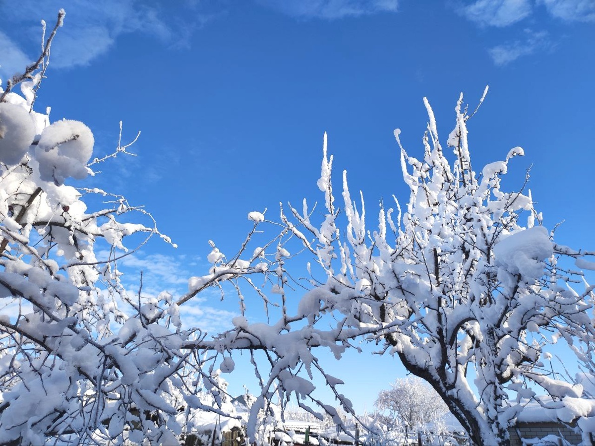 Вот и появился интернет после 6 дней отсутствия. Это не самое страшное, потому что у некоторых света не было 5 дней. Давно в наши места не приходила такая снежная зима. Циклоны периодически приходят в разные части края. В этот раз, конечно, очень сильный был. По краю – в равнинной части выпало 45 – 50 см. В Майкопе (Адыгея) дошло до 1 метра – 1,2 м. Это о чём слышал. Снег на равнинной части пошёл 30 декабря с утра. Шёл сильно и продолжал сыпать до обеда 31 декабря. Засада заключалась в том, что он был мокрым. Ноль градусов и сильный снег. Уже днём пошли налипания и первые обрывы, обломы веток. К вечеру стало подмораживать. Снег же шёл и продолжал налипать. Поэтому и стало провода рвать, да и ветки, даже деревья начали падать от такой тяжести. Это хорошо ещё, что не было ветра. Вот тогда бы точно режим ЧС не в двух районах, а во всех, где прошёл снежный фронт, объявлять пришлось бы. 31 декабря было пасмурно. 1 января вышло солнце, и вот такая красота открылась взору. Решил показать Ва