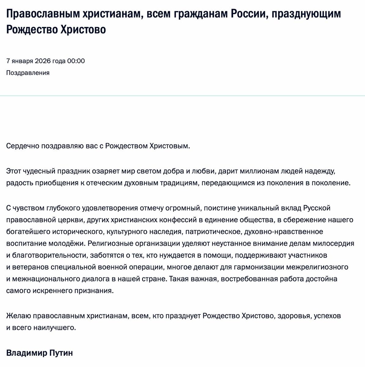Владимир Путин поздравил православных христиан и всех граждан России, празднующих Рождество Христово. "Этот чудесный праздник озаряет мир светом добра и любви, дарит миллионам людей надежду, радость приобщения к отеческим духовным традициям, передающимся из поколения в поколение".
