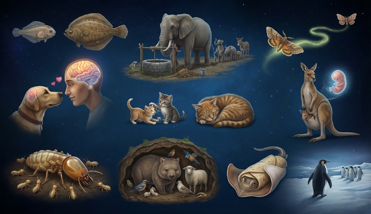 В живом мире скрыто столько удивительных историй, что даже самое живое воображение порой не поспевает за реальностью. Некоторые существа меняют облик до неузнаваемости, другие способны чувствовать воду сквозь толщу земли, а третьи — влюбляются, едва сделав первый вдох. За кажущейся простотой повседневной жизни животных кроются сложные стратегии выживания, поразительная забота и даже настоящий героизм. Личинки камбалообразных появляются на свет с глазами, расположенными симметрично — по одному с каждой стороны головы, как у большинства рыб. Однако по мере взросления один глаз мигрирует через череп к другому, так что оба оказываются на одной стороне тела — либо слева, либо справа, в зависимости от вида. У палтуса, например, оба глаза обычно находятся справа. Слоны обладают невероятной чувствительностью: они способны улавливать присутствие подземных водоносных слоёв. С помощью бивней, ног и хобота они выкапывают воду, и другие животные, понимая это, терпеливо дожидаются своей очереди у та