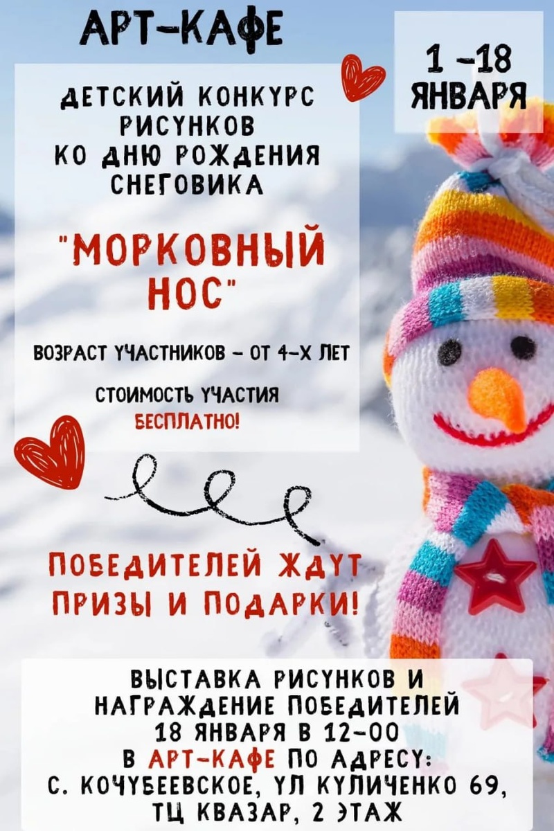 ☃️🎇 Творческая мастерская Арт-кафе с 1 по 18 января проводит детский конкурс рисунков «Морковный нос», посвященный Дню рождения Снеговика