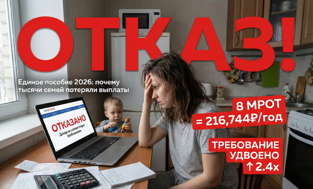 С 1 января 2026 года тысячи российских семей столкнулись с неожиданностью: им отказали в едином пособии на детей. Причина — новое жёсткое требование к доходу. Теперь каждый взрослый в семье должен зарабатывать минимум 8 МРОТ в год. Это в два раза больше, чем было в 2025-м. Разбираемся, кто под ударом и что делать. Для получения единого пособия на детей до 17 лет и для беременных было введено правило: каждый трудоспособный член семьи должен иметь доход. Было в 2025 году: минимум 4 МРОТ в год на взрослого = 89,760 рублей (около 7,5 тыс/месяц) Стало с 2026 года: минимум 8 МРОТ в год = 216,744 рубля (около 18 тыс/месяц) ⚠️ Требование выросло в 2,4 раза! Если у взрослого члена семьи нет дохода или он меньше 216,744 рублей в год, пособие не назначат. Исключение — если есть уважительная причина (об этом ниже). Группы риска: ❌ Мамы в декретном отпуске с детьми до 3 лет (если нет уважительной причины) ❌ Студенты очных отделений старше 23 лет (студентам до 23 лет — уважительная причина) ❌ Фрила