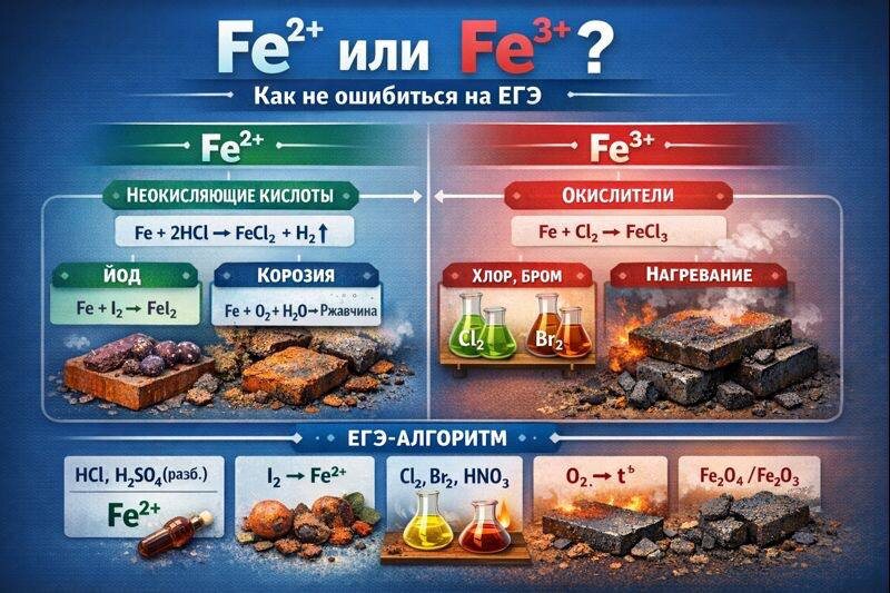 ) У железа две устойчивые степени окисления: +2 и +3. Чтобы выбрать правильную на ЕГЭ, всегда смотри на реагент и условия реакции. 🔹 Неокисляющие кислоты → Fe²⁺ Если железо реагирует с кислотой, которая не является окислителем, оно отдаёт 2 электрона. Fe + 2HCl → FeCl₂ + H₂↑ Fe + H₂SO₄(разб.) → FeSO₄ + H₂↑ ✔ железо → Fe²⁺ ✔ выделяется H₂ 🔸 Галогены: не все одинаковы Хлор и бром → Fe³⁺ Fe + Cl₂ → FeCl₃ Fe + Br₂ → FeBr₃ Йод → Fe²⁺ Fe + I₂ → FeI₂ 📌 Йод — самый слабый окислитель среди галогенов. 🔸 Кислород: всё решают условия ❄️ Без нагревания в сухом воздухе → реакции нет во влажном воздухе → коррозия 4Fe + 3O₂ + 6H₂O → 4Fe(OH)₃ → Fe₂O₃·nH₂O ✔ образуется ржавчина ✔ рыхлая, НЕ защитная 🔥 При нагревании 3Fe + 2O₂ → Fe₃O₄ 4Fe + 3O₂ → 2Fe₂O₃ ✔ образуется железная окалина ✔ плотный слой оксидов ✔ железо в степенях +2 и +3 🧠 ЕГЭ-алгоритм HCl, H₂SO₄(разб.) → Fe²⁺ Cl₂, Br₂ → Fe³⁺ I₂ → Fe²⁺ O₂ + H₂O → ржавчина O₂ + t° → окалина 📌 Сохрани пост — здесь теряют баллы чаще всего. 🔔 По