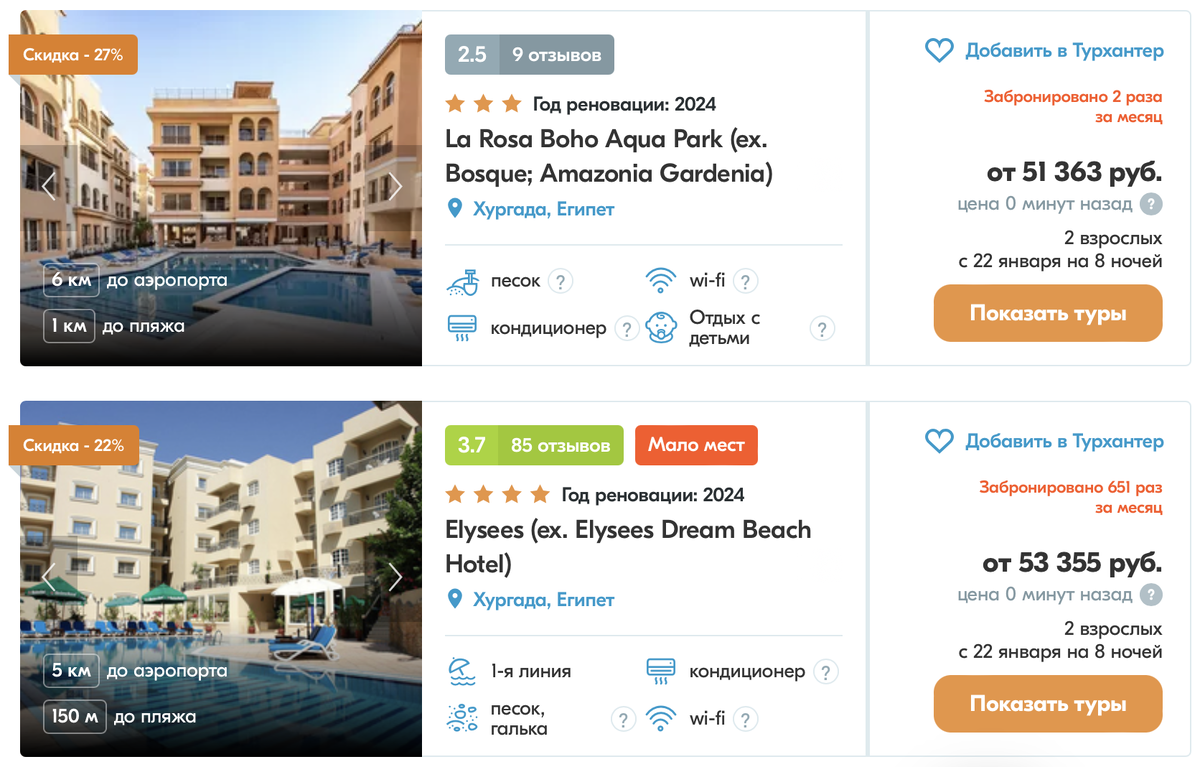 Чаще всего это будут отели на второй и третьей линии со средненьким сервисом. Что интересно, купить тур в Египет можно даже дешевле, но скорее всего это уже будут отели 3* и в большинстве случаев только с завтраками. Если появляются туры по интересным ценам в разные страны, ссылками на них мы делимся в телеграм. Впрочем, бывают и исключения. Покупая тур на агрегаторах, в фильтрах стоит выбрать высокий рейтинг, например, 4,5 из 5. Это поможет увидеть максимально достойные варианты. В свое время удалось купить тур в отель, который при сортировке по цене стоял самым первым, т.е. это было самое дешево