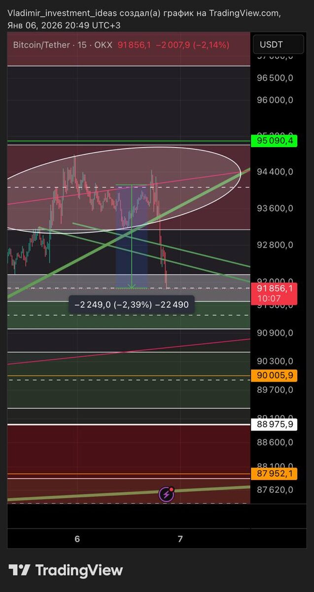 Собственно я Вас предупреждал о снижении #BTC хочу сказать только что лимитку на 91300 я убрал, так в ней уже не вижу смысла. Лимитки остальные да, держу)))