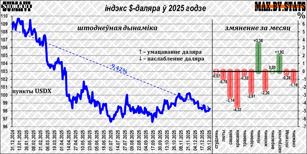 Рухі абменных курсаў галоўных замежных валют у Рэспубліцы Беларусь ў 2025г. адбываліся жорстка ў рамках стабільнага кошту валютнага кошыка Нацыянальнага банка Беларусі, і таму дакладна адлюстроўвалі ўзаемныя крос-курсы. Такім чынам, рознанакіраванасць курсавога руху, чым быў адметны год, меў знешні базіс. Найбольш важлівым ў гэтым знешнім кантэксце ў 2025-м было: 1. Аслабленне даляра ЗША на амаль што 10% па вынікам года: індэкс даляра USDX (суадносіны $-даляра да кошыка з 6-ці валютаў: €-еўра, ¥-японскай ены, £-фунта стэрлінгаў, C$-канадскага даляра, kr-шведскай кроны і ₣-швейцарскага франка) знізіўся за год на 9,42%: ў канцы 2024г. USDX складаў 108,5 пунктаў, напрыканцы 2025-га – 98,26 пунктаў. 2. Значнае ўмацаванне расійскага рубля: да даляра ЗША ₽-рубель ($/₽) па вынікам года стаў даражэй на 30,0% (курс даляра ў Расіі ($/₽) вырас на 23,1%). Асноўны рост ₽-рубля прыйшоўся на першыя 5 месяцаў. Валютны кошык Нацыянальнага банка Беларусі складаецца на 60% з ₽-рубля, на 30% з $-даляра і