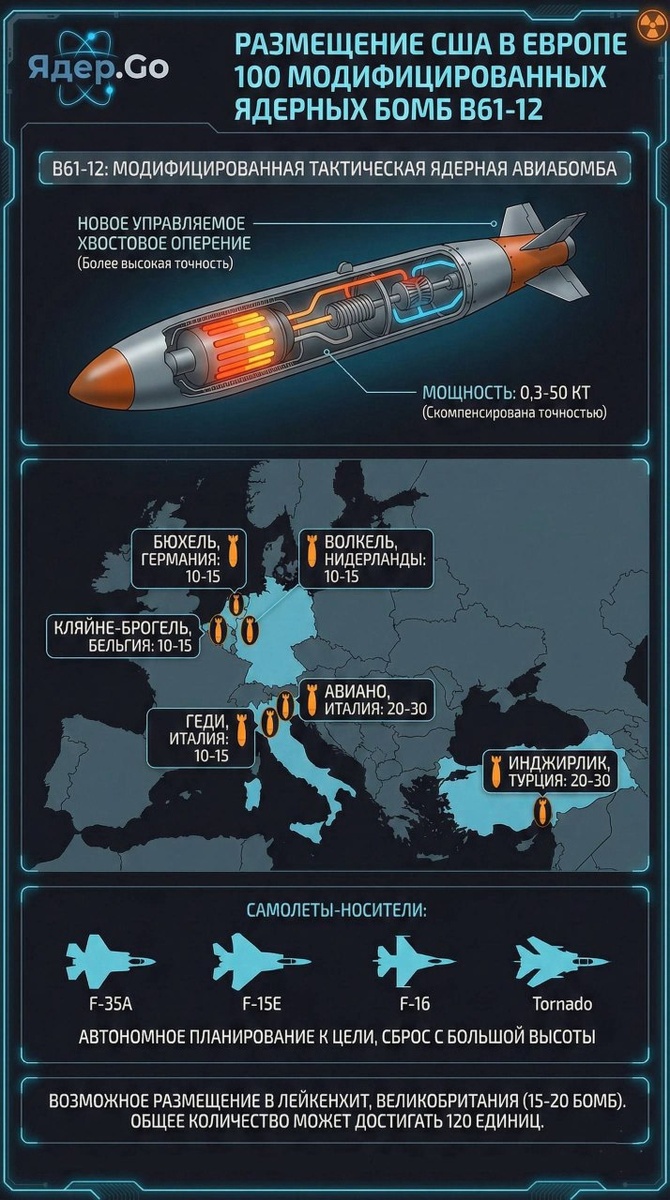 По данным Бюллетеня ученых-атомщиков и Федерации американских ученых, Соединенные Штаты разместили на шести авиабазах в Европе около 100 модернизированных тактических ядерных авиабомб B61-12. География размещения: • Бюхель (Германия) – 10-15 единиц • Кляйне-Брогель (Бельгия) – 10-15 единиц • Волкель (Нидерланды) – 10-15 единиц • Геди (Италия) – 10-15 единиц • Авиано (Италия) – 20-30 единиц • Инджирлик (Турция) – 20-30 единиц Не исключается размещение еще 15-20 бомб на британской авиабазе Лейкенхит, что доводит общее количество до 120 единиц. Технические особенности B61-12: Новая модификация заменила устаревшие варианты 3, 4, 7 и 10. Несмотря на меньшую мощность (0,3-50 килотонн), эффективность боеприпаса значительно возросла благодаря управляемому хвостовому оперению. Бомба сбрасывается с большой высоты и автономно планирует к цели на расстояние в несколько километров с возможностью корректировки траектории. Это делает B61-12 гораздо более точным оружием по сравнению с предшественн