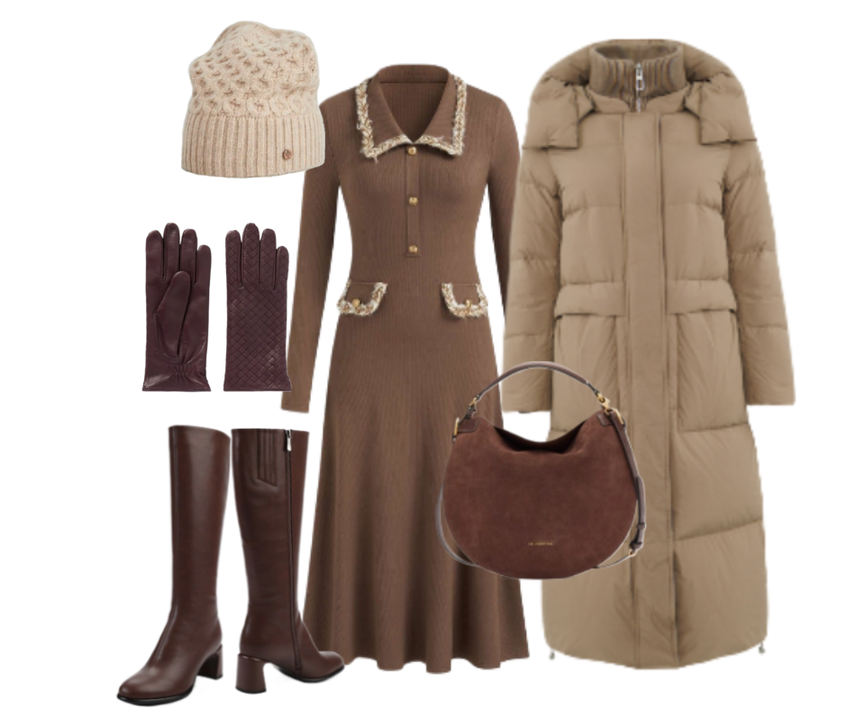 Трикотажное платье давно стало незаменимой вещью в гардеробе каждой модницы. Оно не только согревает в холод, но и позволяет создавать разнообразные, элегантные и комфортные образы. В этой статье собрала 10 вдохновляющих идей, как носить трикотажное платье зимой и выглядеть безупречно. Платье миди цвета мокко с акцентным воротничком и пуговицами в сочетании с высокими сапогами выглядит утонченно и изысканно. Длинный пуховик обеспечивает максимальное тепло и создает гармоничный цветовой переход. Замшевая сумка, кожаные перчатки и шапка бини идеально дополняют образ. Темно-синее платье-поло добавляет образу динамичности и спортивного настроения. Пуховая куртка молочного цвета с меховым воротником создает интересный акцент. Бежевые ботинки - практичный и стильный выбор. Сумка и аксессуары поддерживают общую цветовую гамму. Облегающее черное трикотажное платье с акцентным воротничком и рукавами - классика, которая всегда выглядит элегантно. Длинная шубка с поясом добавляет нотку роскоши