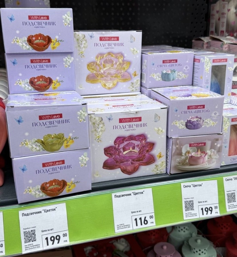 А в наличии уже много подарочных вариантов. Привезли красивые подсвечники. Есть фарфоровые в виде цветочков. Они в ассортименте. Цена 199 рублей. Также в ассортименте по цвету есть стеклянные подсвечники Цветок. Цена 116 рублей. А какие красивые свечи в подсвечнике в виде цветка. Они в ассортименте. Цена 199 рублей.