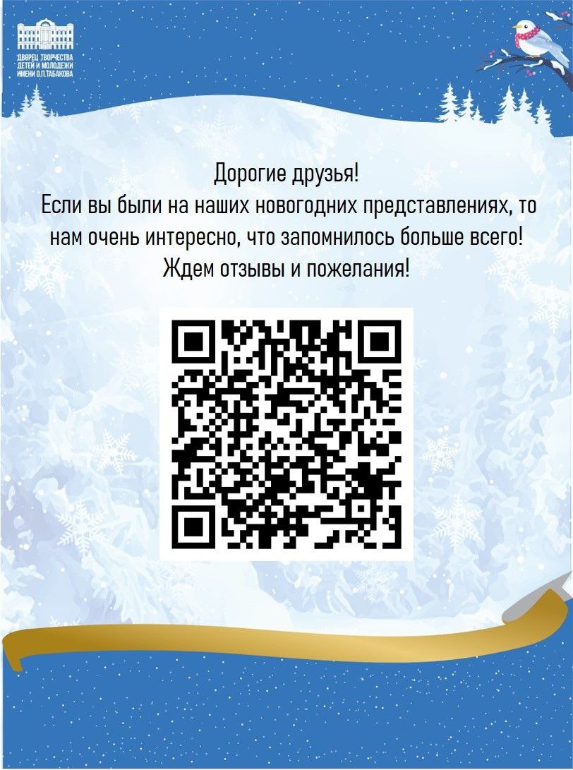 ! 💯💯💯Мы были рады каждому зрителю, надеюсь мы смогли подарить вам сказку и нвогоднее чудо! 🙏Нам очень интересно ваше мнение, оставить его можно, отсканируя код или по ссылке https://yandex.ru/profile/91269287975?lang=ru ☃А мы не прощаемся, следите за новостями - впереди много интересного!