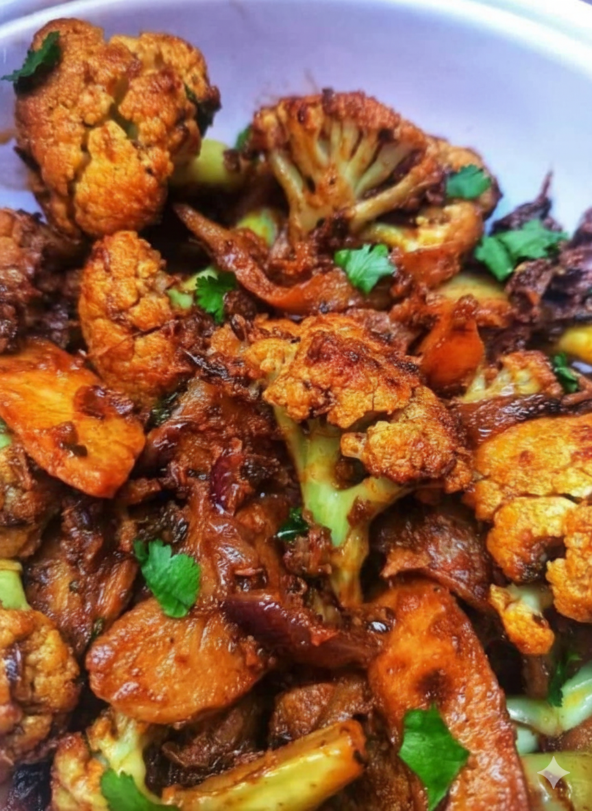 В индийской кухне есть блюда, которые кажутся удивительно простыми по составу, но при этом раскрываются сложным, глубоким вкусом. Алу гоби масала — как раз из таких. Всего два основных овоща, немного специй и правильная техника приготовления превращают обычную цветную капусту с картофелем в настоящее гастрономическое путешествие. Алу гоби — одно из самых популярных домашних блюд на севере Индии. Его готовят в семьях, подают в вегетарианских кафе, берут с собой на обед и часто ставят на праздничный стол. Название говорит само за себя: «алу» означает картофель, «гоби» — цветная капуста. Это блюдо любят за универсальность. Оно сытное, но не тяжелое, ароматное, но не агрессивно острое, и прекрасно сочетается с лепешками чапати, нааном или обычным рисом. А еще алу гоби отлично показывает философию индийской кухни: вкус рождается не из сложных ингредиентов, а из баланса специй. Главная магия алу гоби масала — в специях. Куркума дает теплый золотистый цвет и легкую горчинку, зира добавляет о