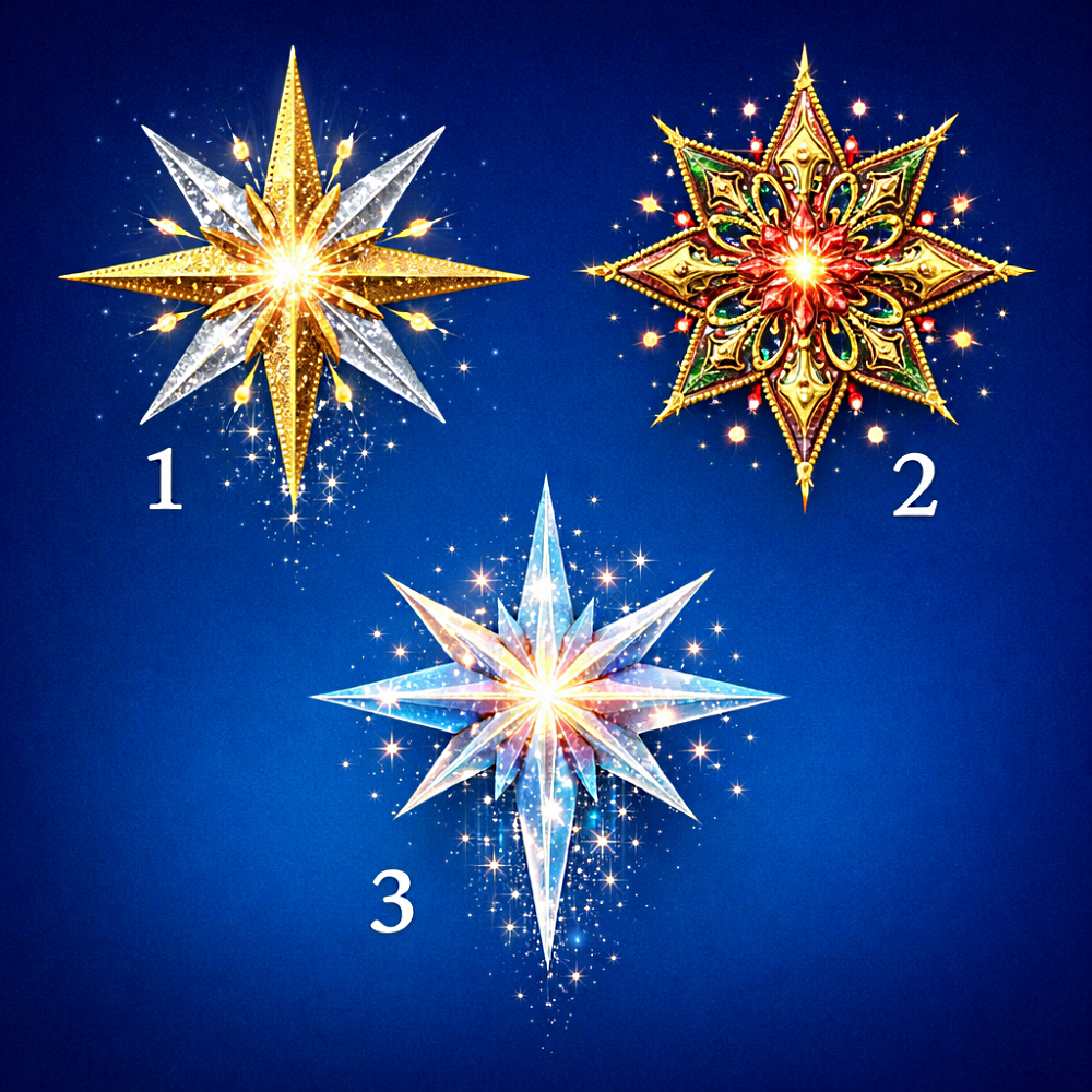 Здравствуйте, друзья! С давних времён рождественская звезда считалась символом надежды и света. Она указывает путь, напоминает о добре и согревает сердце, особенно в холодные зимние дни. В праздничное время люди чаще задумываются о будущем, о том, принесёт ли жизнь радость и спокойствие. На этой картинке вы видите три совершенно разные звезды, каждая со своим характером и светом. Выберите ту, которая притягивает вас больше всего. Внутри скрыто маленькое послание для вашей души. Звезда 1 Если вы выбрали звезду под номером один, ваша жизнь скоро наполнится спокойной радостью. Судьба говорит: впереди период стабильности и уюта. Мелкие заботы, привычные дела и общение с близкими подарят вам тихое удовлетворение. Вы почувствуете, что всё идёт своим чередом, и это принесёт ощущение безопасности. В ближайшие месяцы вы сможете завершить старые дела, навести порядок в мыслях и окружении, освободив место для новых идей. Ваша радость будет простой, но настоящей. Важнее всего сейчас — ценить привы