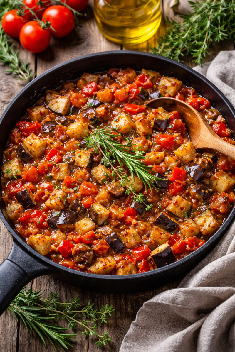 Домашний рататуй: аромат лета на обычной сковороде Этот рататуй — один из тех рецептов, которые кажутся простыми, но в итоге удивляют насыщенным вкусом и ароматом. Никакой суеты и сложных техник — только свежие овощи, специи и правильная последовательность приготовления. Блюдо подойдёт для лёгкого ужина, как гарнир к мясу или рыбе, а в холодном виде станет отличной овощной закуской. Чеснок очистите и слегка придавите лезвием ножа, чтобы он активнее отдал аромат. Остальные овощи тщательно вымойте, обсушите и нарежьте аккуратными кубиками примерно 1×1 см — так они прожарятся равномерно и сохранят красивую текстуру. С веточек тимьяна снимите листочки. В широкой тяжёлой сковороде разогрейте растительное масло. Выложите чеснок и прогрейте его до появления аромата. Добавьте баклажаны, слегка посолите и обжаривайте на сильном огне 3–4 минуты, постоянно помешивая. Баклажаны должны слегка подрумяниться, но остаться сочными. Переложите их в отдельную миску, сковороду оставьте на огне. В ту же с