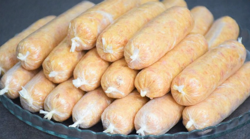 Я долго искала тот самый удачный состав и способ, который давал бы стабильно хороший результат. И кажется, нашла. Эти сосиски стали для меня настоящей палочкой-выручалочкой: их можно подать детям на ужин с гарниром, взять с собой на пикник или просто съесть с хлебом, когда нет времени на готовку. И да, вы точно будете знать, из чего они сделаны. Всё начинается с мяса. Я беру 1,5 кг куриного филе, чаще всего бедра — оно сочнее и не такое сухое, как грудка. Филе хорошо промываю, промокаю бумажными полотенцами, чтобы убрать лишнюю влагу — это важно для консистенции фарша. Затем нарезаю мясо произвольными кусками и пропускаю через мясорубку со средней решеткой. Можно, конечно, использовать и блендер, но мясорубка дает ту самую идеальную, однородную, но не пастообразную текстуру. Перекладываю фарш в большую миску, удобную для вымешивания. Теперь время специй. Я добавляю к мясу по чайной ложке сладкой молотой паприки, сушеного чеснока и готовых специй для курицы (там обычно есть травки вроде