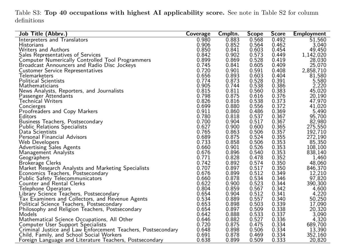 В 2025 году исследователи Microsoft опубликовали работу, основанную не на прогнозах, а на анализе более 200 000 реальных диалогов пользователей с Bing Copilot. Цель была практической: понять, какие рабочие задачи люди уже сегодня делегируют ИИ и что это означает для разных профессий. Авторы связали диалоги с базой O*NET, где каждая профессия разложена на типовые рабочие активности и ввели метрику AI Applicability Score, оценку того, какая доля задач в профессии в принципе уже сейчас лежит в зоне применимости ИИ. Это не вероятность увольнения, а индикатор степени трансформации работы. Главный вывод прост. Генеративный ИИ в первую очередь бьет по информационному труду, то есть задачам, связанным с текстами, знаниями, объяснениями и анализом. В реальном использовании Copilot чаще всего пишут и редактируют тексты, готовят справки, объясняют сложные темы и отвечают клиентам. Поэтому в верхней части рейтингов оказываются переводчики, журналисты, редакторы, авторы, PR, службы поддержки,