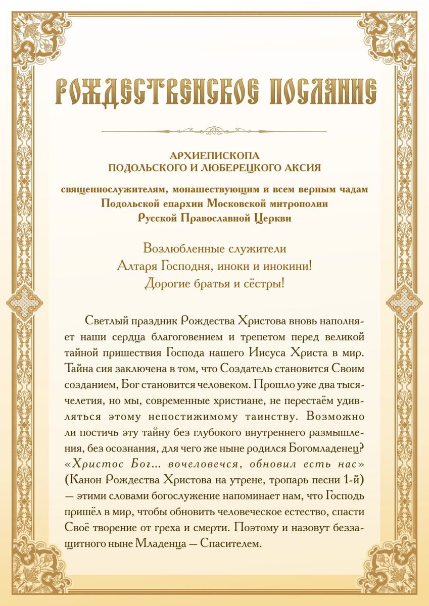Рождественское послание архиепископа Подольского и Люберецкого Аксия