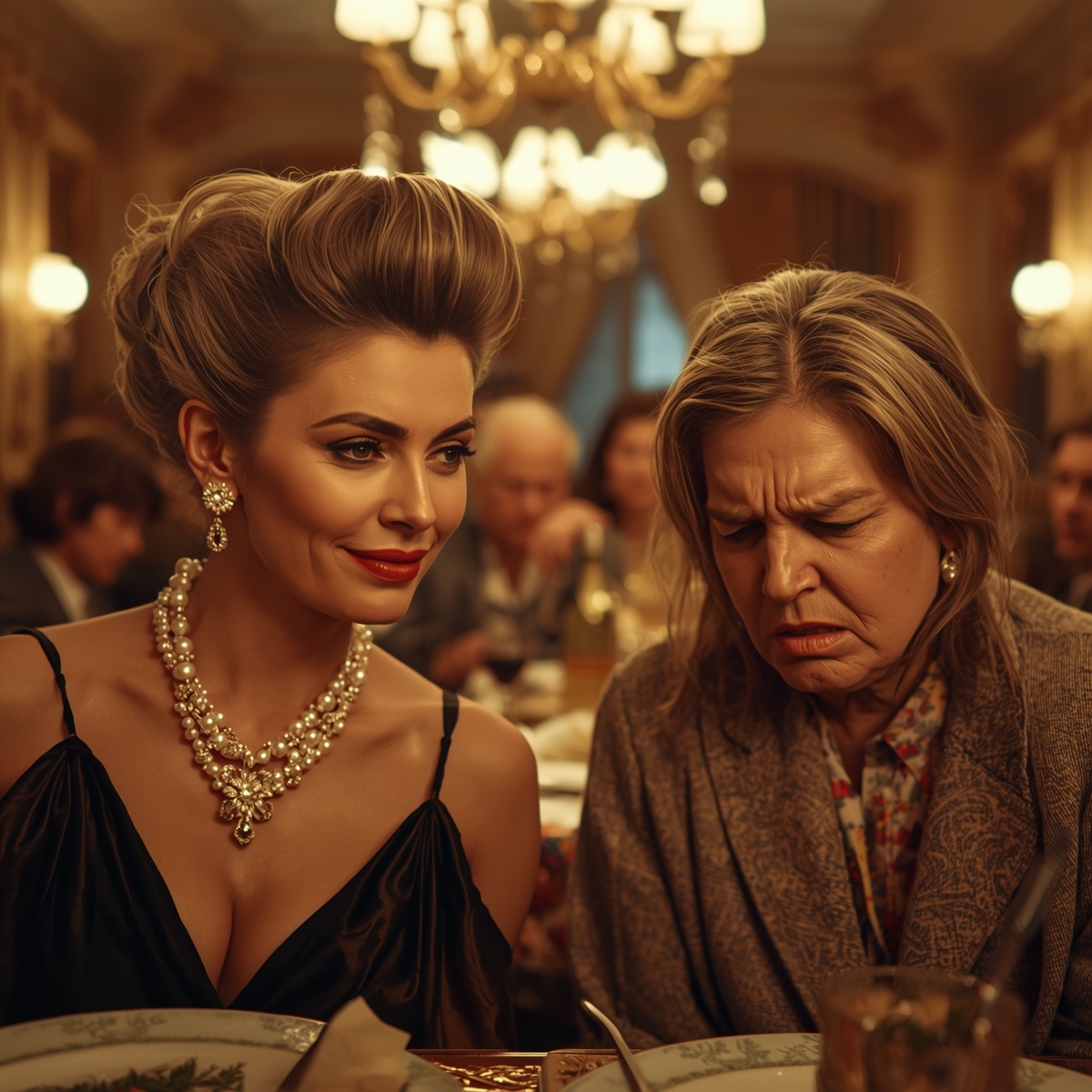 Ресторан был действительно дорогим и пафосным. Белые скатерти, официанты во фраках, золотая посуда, живая музыка. Лидия Петровна сидела во главе стола, растерянная и смущённая. Она была простой женщиной, проработавшей всю жизнь на текстильной фабрике. Весь этот лоск был ей чужд.