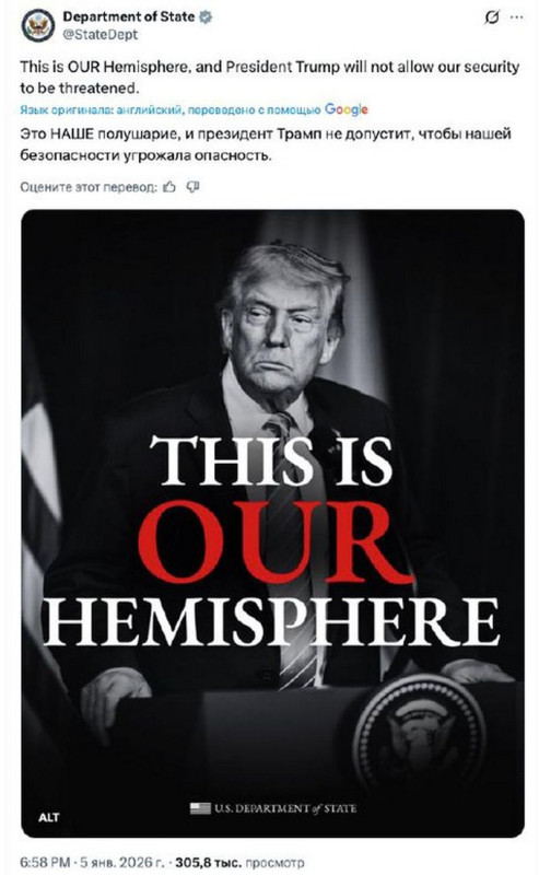«Это НАШЕ полушарие», заявляет Госдепартамент США о Западном полушарии Земли. Это может свидетельствовать о том, что администрация Трампа в международной политике начала ориентироваться на «доктрину Монро», провозглашённую в 1823 году президентом Джеймсом Монро — «Америка для американцев». Её суть заключалась в том, что европейские державы не должны вмешиваться в дела стран Западного полушария (Северной и Южной Америки), а в ответ США обещали не вмешиваться в европейские дела и войны.