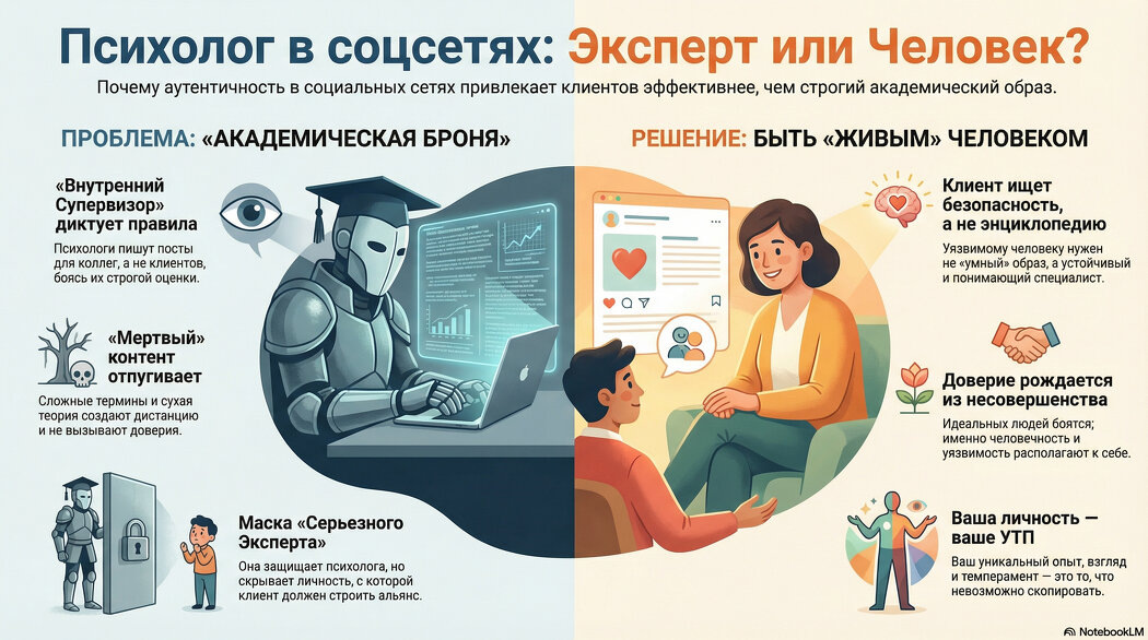 Знакомая ситуация? Вы пишете пост. Перечитываете. Кажется, что слишком просто. Добавляете пару терминов про «фрустрацию» и «интроекты». Перечитываете. Кажется, что слишком лично. Убираете живой пример, заменяете его на сухую теорию. В итоге в ленту уходит текст, похожий на страницу из учебника: правильный, полезный и... совершенно «мертвый». А вместо своей фотографии вы снова ставите картинку с чашкой кофе или абстрактный пейзаж. Почему нам, экспертам в человеческих душах, так страшно показать свою собственную человечность? Внутренний Супервизор не дремлет Главная причина «немоты» в соцсетях — это фантазия о том, кто нас читает. Когда психолог пишет пост, он часто бессознательно пишет его не для клиентов. Он пишет его для Коллег. В голове сидит строгий Внутренний Супервизор (или образ значимого учителя), который оценивает каждое слово: Мы надеваем маску «Серьезного Эксперта». Эта маска — наша защита. Она соткана из дипломов, сложной терминологии и отстраненного тона. Нам кажется, что е
