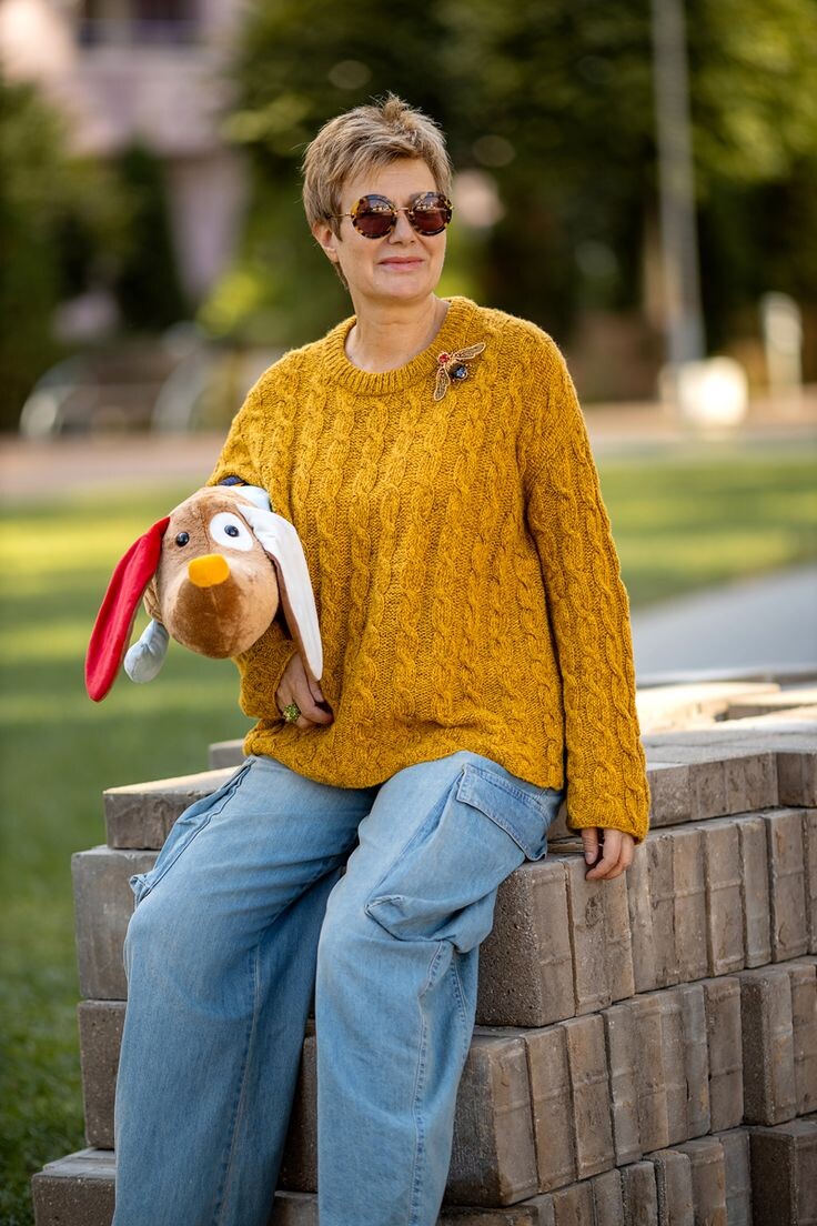 Как сильно ошибается тот, кто считает, что вязаные предметы гардероба – прерогатива исключительно бабушек. Свитера, кардиганы и джемперы могут быть и стильными, и эффектными, и образы с ними модные дамы 50+ умеют создавать очень даже элегантные и изысканные. 1. Изящный свободный джемпер фактурной вязки насыщенного горчичного тона с одной стороны достаточно прост и лаконичен, с другой – очень элегантен и способен сделать более изящным практичный повседневный образ женщины 50+. Например, такой джемпер отлично сочетается со светло-голубыми джинсами с крупными квадратными накладными карманами на бедрах. 2. Белый джемпер с элементами фактурной вязки и оригинальными оформлением ворота и манжет – интересная модель, которая вносит освежающую нотку в образ зрелой модницы. Свободный фасон джемпера минималистичен, хорошо смотрится в ансамбле, например, с классическими черными брюками, а для декорирования такой вещи можно использовать достаточно крупную и заметную оригинальную брошь. 3. Золотисто-