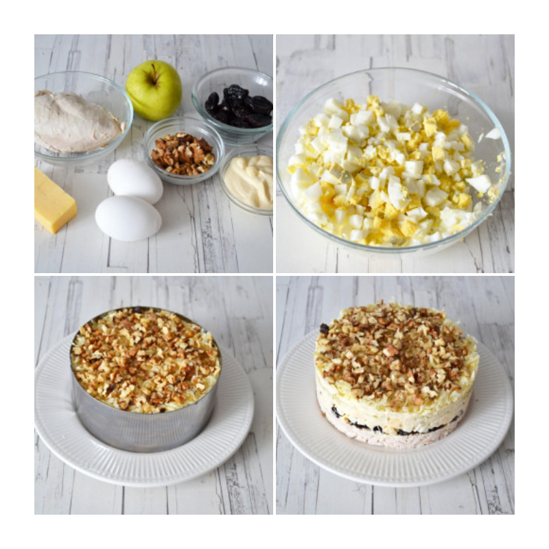 ● Установите кулинарное кольцо на тарелку. Выложите слоями: курица + майонез, чернослив + майонез, яйца + майонез, яблоко + майонез, сыр + майонез. Сверху посыпьте рублеными орехами.