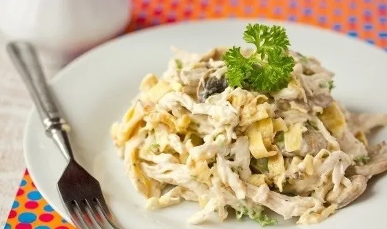 У этого салата очень гармоничный и сбалансированный вкус, а также он сытный и питательный. Подойдет как для праздника, так и для обычного семейного ужина.